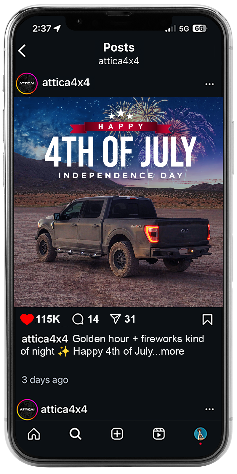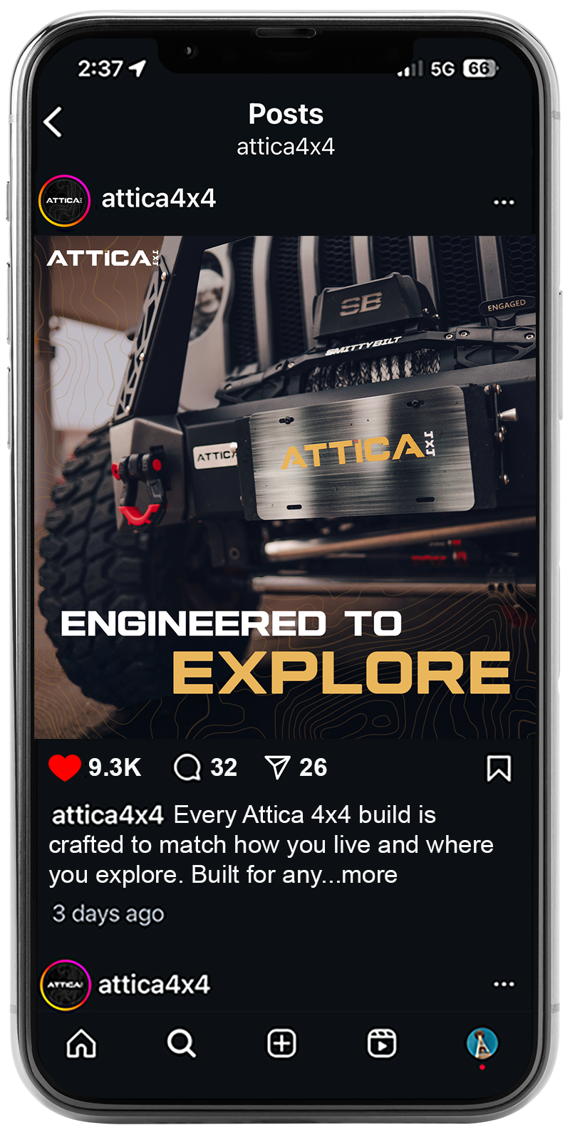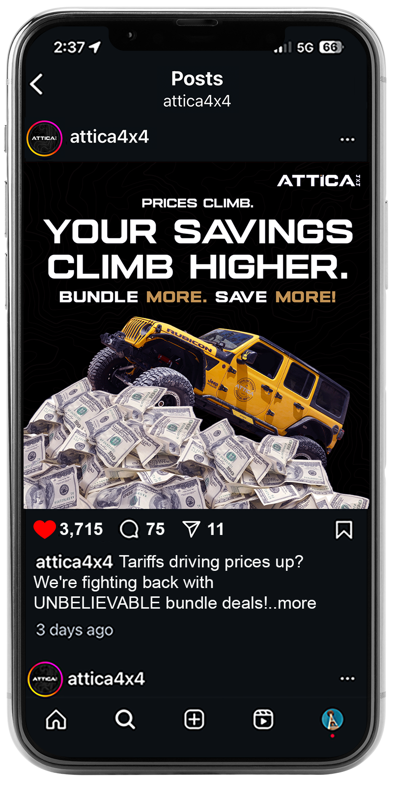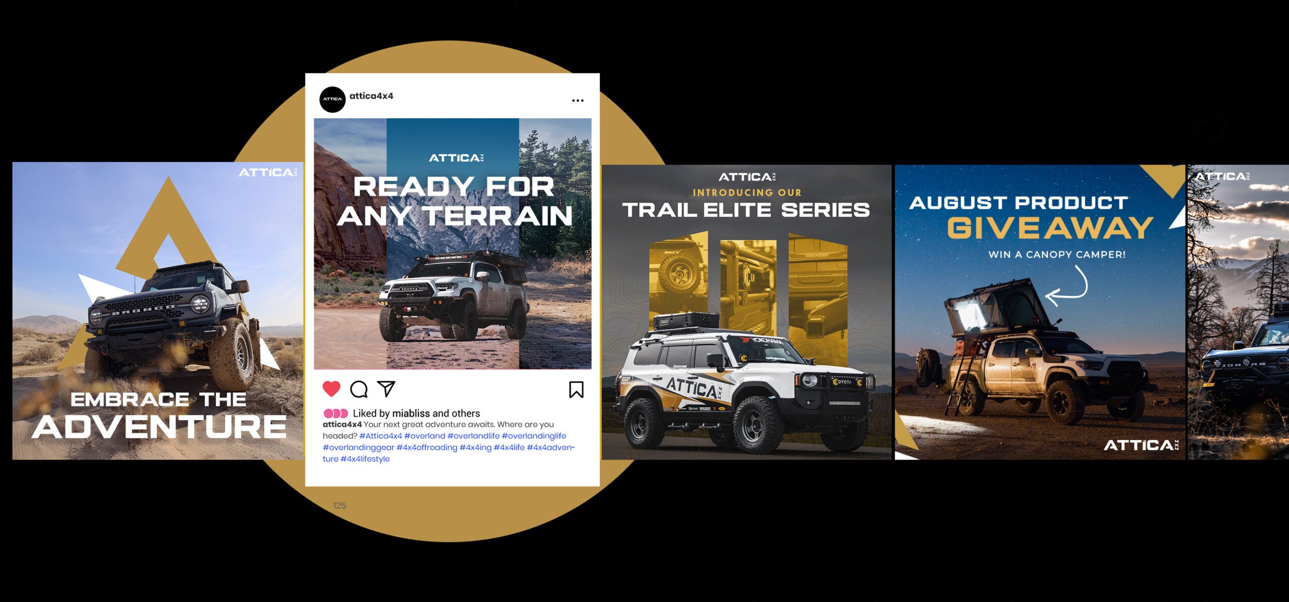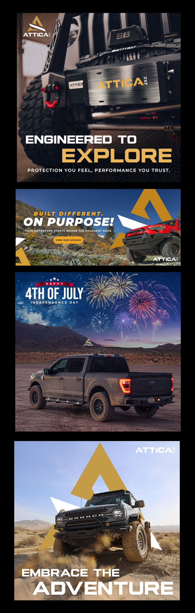 As the Senior Visual Designer for Attica 4×4, I led all visual branding efforts in design, video, and social content. Attica needed stronger brand recognition and increased engagement across their website, Instagram, Facebook, and YouTube. The challenge was enhancing an already solid in-house brand to generate more leads and deeper customer interaction. Through targeted campaigns, high-quality design work, and dynamic videos, we elevated their online presence and website sales, leading to a renewed yearly contract. I worked closely with our ad specialists, project manager, and copywriter in weekly brainstorms to execute high-impact ideas that drove measurable results.